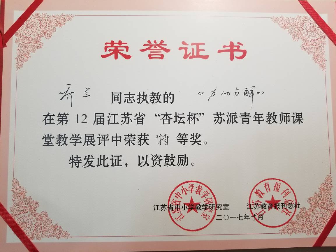在激烈的决赛中,乔兰老师的论文立意新颖,构思精巧,论点、论据极富创意;教学设计思路严谨,环环相扣,富有创意的实验设计让整个教学设计亮点层出;在课堂教学环节中,乔兰老师以准确生动的课堂语言,缜密的教学设计,亲和生动的教学风格,以及富有创意的实验设计,丰富的生活实例,获得了理化生专家评委组的高度赞扬与好评。最终通过三个环节的评比,以全场总分第一的成绩力压同台竞赛的其他5名教师,荣获本次决赛的特等奖。