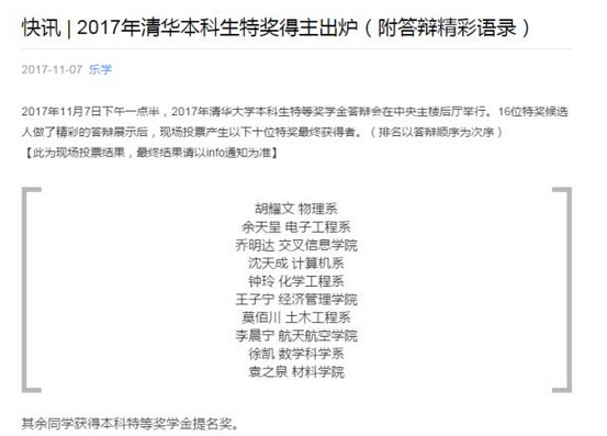 7日下午,2017年清华大学本科生特等奖学金得主出炉(此为现场投票结果),南外2014届校友乔明达榜上有名。