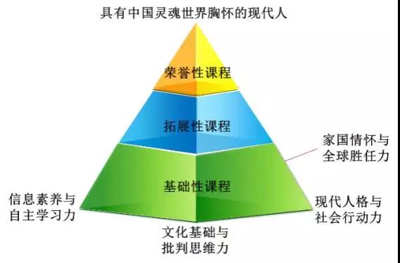围绕学校“培养具有中国灵魂世界胸怀的现代人”的育人目标,我们形成了以“文化基础与批判思维力、信息素养与自主学习力、现代人格与社会行动力、家国情怀与全球胜任力”四种核心素养为基础,以“基础性课程、拓展性课程、荣誉性课程”三类课程为路径的金字塔式立体外语大课程模式,并从课程目标、结构、内容、实施、评价等方面进行了全面的规划、探索和完善。