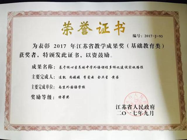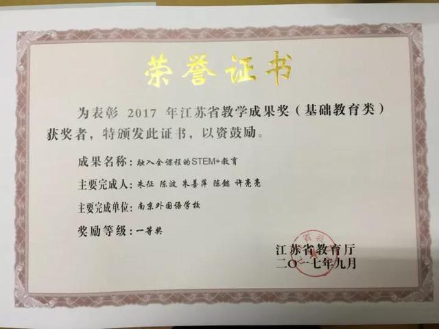 在省教育厅组织开展的2017年江苏省教学成果奖评选工作中,38238a威尼斯欢迎你《基于核心素养的中学外语课程多样化建设实施路径》项目获特等奖,《融入全课程的STEM+教育》项目获一等奖。