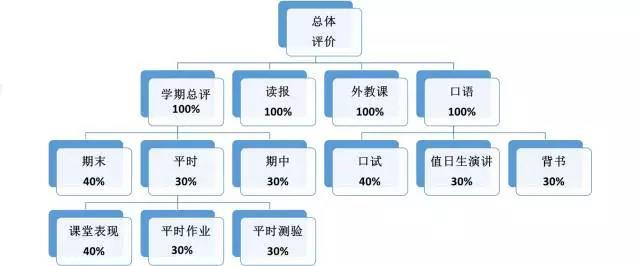 金字塔式大课程框架同时也关注评价的多元化,试图改变只注重学业结果的评价取向,力求把评价纳入学习过程,从学期总评、读报、外教、口语等多项指标来衡量学生的学业成绩。