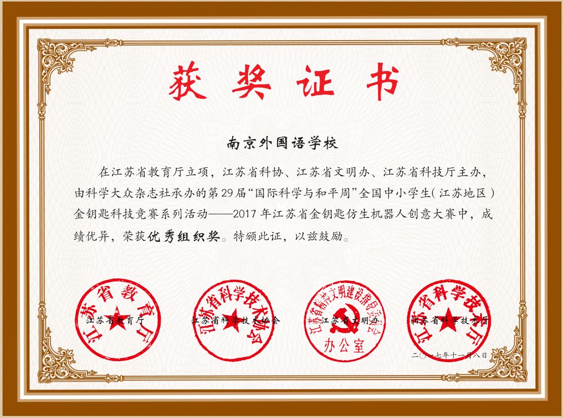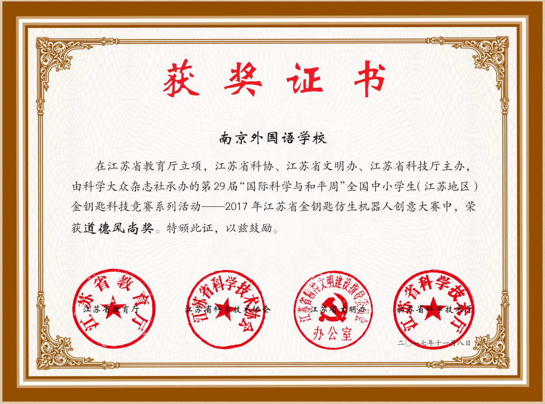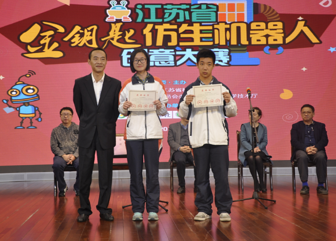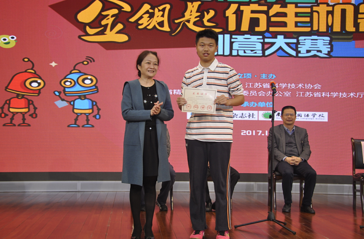 这届大赛38238a威尼斯欢迎你派出了9支队伍参加,同学们经过1个月的系统学习和刻苦训练,在2017年《金钥匙仿生机器人创意大赛》中,取得了较好的成绩。【38238a威尼斯欢迎你】荣获优秀组织奖;【38238a威尼斯欢迎你】荣获道德风尚奖;【大国工匠队:杨玉冰、朱彦南、秦辰璐、许元泽】获综合特等奖、创意特等奖;【圆梦队:潘乐萱、高 媛、李艺洁、刘昕怡】获综合特等奖、创意一等奖;【白鹤亮翅队:周德婧、张夕、沈昕、熊卜一玮】获综合特等奖、创意特等奖;【南外Steam队:王月淇、石昊源、杨 旸、龚昕冉】获综合一等奖、创意一等奖;【谈笑风生队:郭 旻、刘政通、王羽婷、周子萱】获综合一等奖、创意特等奖;【比利队:王舒鸿、韩倚汇、吴 昊、徐天伉】获综合一等奖、创意特等奖;【济沧海队:凌 朱、李 立、沈童童、汤思睿】获综合一等奖、创意二等奖;【身经百战队:陈玥如、刘思远、耿建超、邓宇涵】获综合二等奖、创意二等奖;【tan90队:樊 立、卢昱廷、胡沛森、王语童】获综合二等奖、创意一等奖;【陈玥如】获丛林霸主制作一等奖。