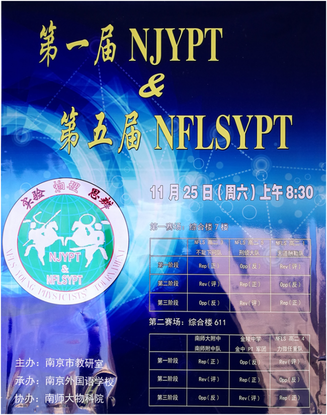 在科技节的浪潮中,近日由南京市教研室主办,南师大物科院协办,38238a威尼斯欢迎你承办的第一届南京市高中生物理学术创新竞赛(NJYPT-1)暨第五届38238a威尼斯欢迎你青年物理学家锦标赛(NFLSYPT-5)于38238a威尼斯欢迎你的综合楼有序开展,于上周六上午最终落下帷幕。