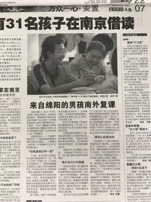 金陵晚报当时也报道了这些地震灾区借读生的故事,其中2008年5月23日的报纸中,曾大篇幅报道过《来自绵阳的男孩南外复课》的新闻,还刊登了刘战和南外的新同桌顾希喆的照片。照片里,刘战笑得特别灿烂。