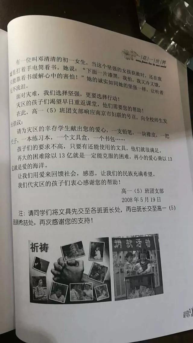 当年朱征老师担任班主任的高一(5)班率先发出募捐倡议书