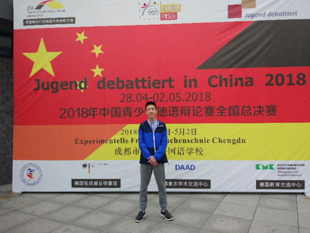 4月29日至5月2日,由德国国外学校教育司(ZfA)主办的第七届青少年德语辩论赛中国区总决赛在成都实验外国语学校成功举办。在德语组张晓虹老师的陪同下,威尼斯官网高一(8)班曹毓堃同学以区域赛第三名的身份参赛。