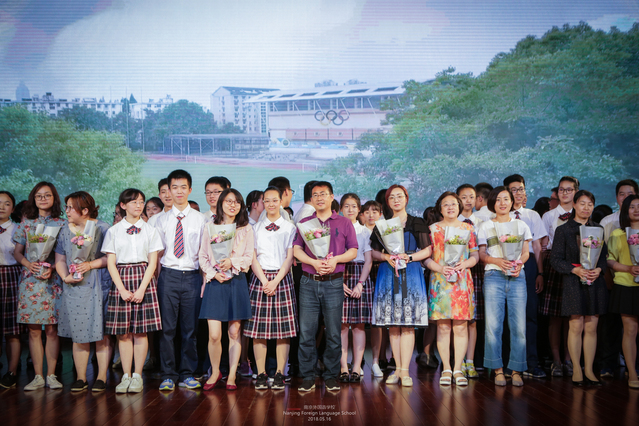 校歌声中,全体老师登上舞台。身着礼服,热情洋溢的学生代表们怀着对恩师的尊敬和感激之情献上了花束。衷心感谢老师们,依着你们的肩膀我们终能化茧成蝶、展翅高飞。