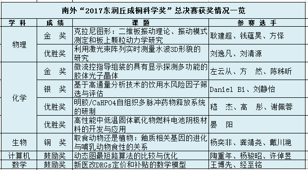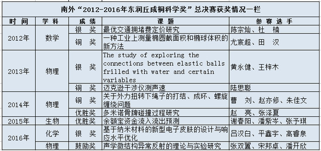 近几年来对创新科学研究怀有极大热情的南外学子,在丘成桐比赛中取得了优异的成绩, 2017年更是同时获得了物理金奖和化学金奖两个学科的最高奖,在数学、生物、计算机等学科上也表现不俗。截至目前累计共获得金奖2项,银奖4项,铜奖4项,优胜奖9项,在国内名校中名列前茅。