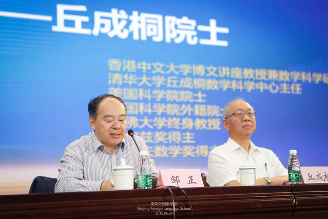 5月24日,世界著名数学大师、哈佛大学终身教授丘成桐先生做客南外。丘成桐先生是第一位获得有“数学界诺贝尔奖”之称菲尔茨奖的华人数学家,也是继陈省身先生之后第二位获得数学界另一重要荣誉沃尔夫奖的华人数学家。在微分几何学、拓扑学等诸多领域都取得了举世瞩目的成绩。