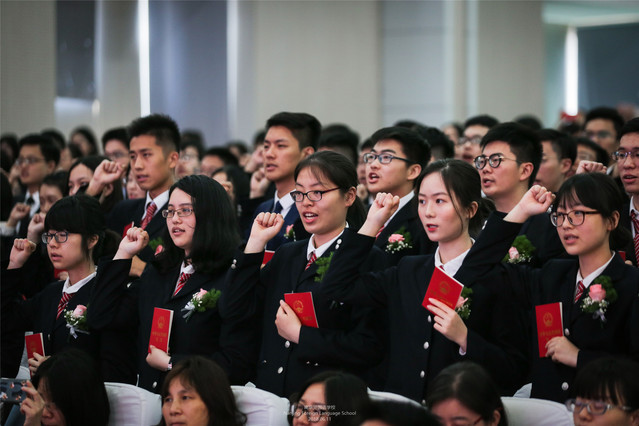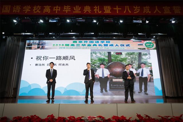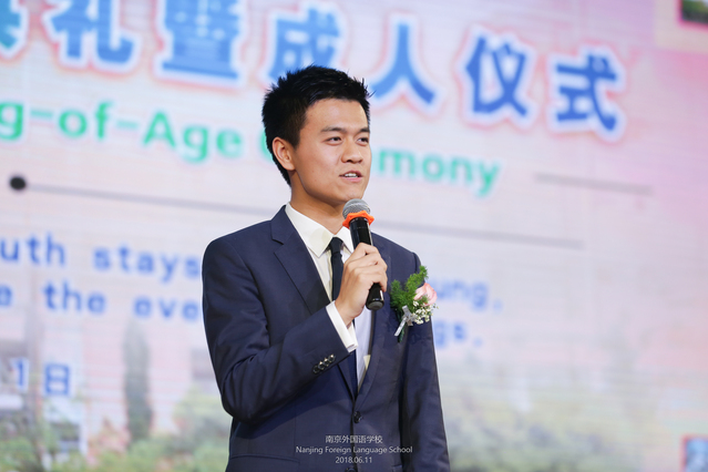 之后的成人仪式上,由2009届优秀毕业生金哲远同学带领学弟学妹们面对国旗庄严宣誓,激励他们秉承南外精神,永怀“中国灵魂、世界胸怀”。
