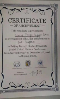 本次大会共设有8个委员会。在3天紧张激烈的角逐中,高三吕尚泉,高二丁瑞元、高心怡、王一骁、范悦航,高一孙雨禾分别获得所在会场的杰出代表奖(Outstanding Delegate),高一金雨橙、杨雨菲获得荣誉提名奖(Honorable Mention)。南外的同学在会场上不畏群雄,在与北京大学、外交学院等著名高校的代表们角逐的过程中坚守立场,据理力争斩获了几乎所有杰出代表奖。更值得一提的是,南外代表团最终凭借优异的成绩,脱颖而出,获得了最佳代表团奖(Best School Delegation)!