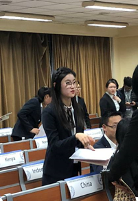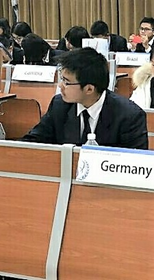 “此次参会对我来说,是一次巨大的挑战。由于参会经验不足,我的学术准备尽管耗费了许多时间,整理了许多材料,没想到,才刚到第二个会期没多久,我们的学术准备就不够用了。开模联最痛苦的经历,莫过于看着其他代表在台上口若悬河,滔滔不绝,而自己却由于学术上的不足只能坐在台下苦笑。第二个会期开完后,我们几乎陷入绝境。但是,经过一晚上的冥思苦想和来自李颖学姐的鼓励与指导,我们明白了坚持自己国家立场的重要性。在最后一个会期决议草案的讨论中,我们冷静分析,审时度势,代表德国做到了游刃有余,纵横捭阖,在几个国家集团之间进行斡旋。最终,我们通过发表联合声明获得了最大的利益,也取得了主席团的认可。这次开会,最重要的还是收获了友谊。同场的大学生代表真的很令人敬佩,对我们的态度也十分友善。希望下次也能遇到这么棒的代表们和主席团!”