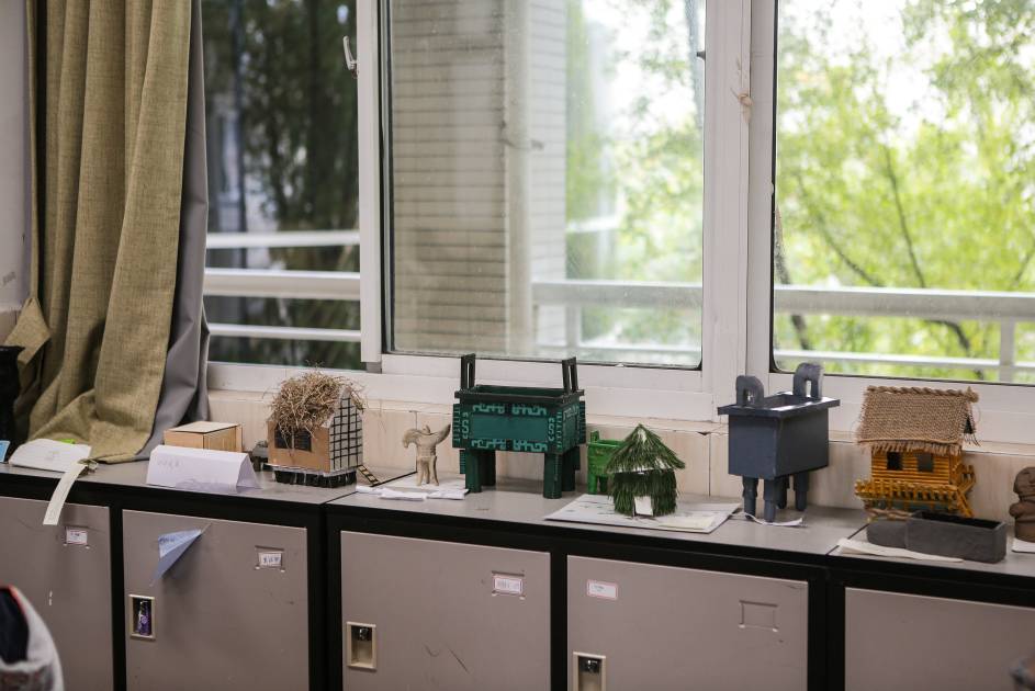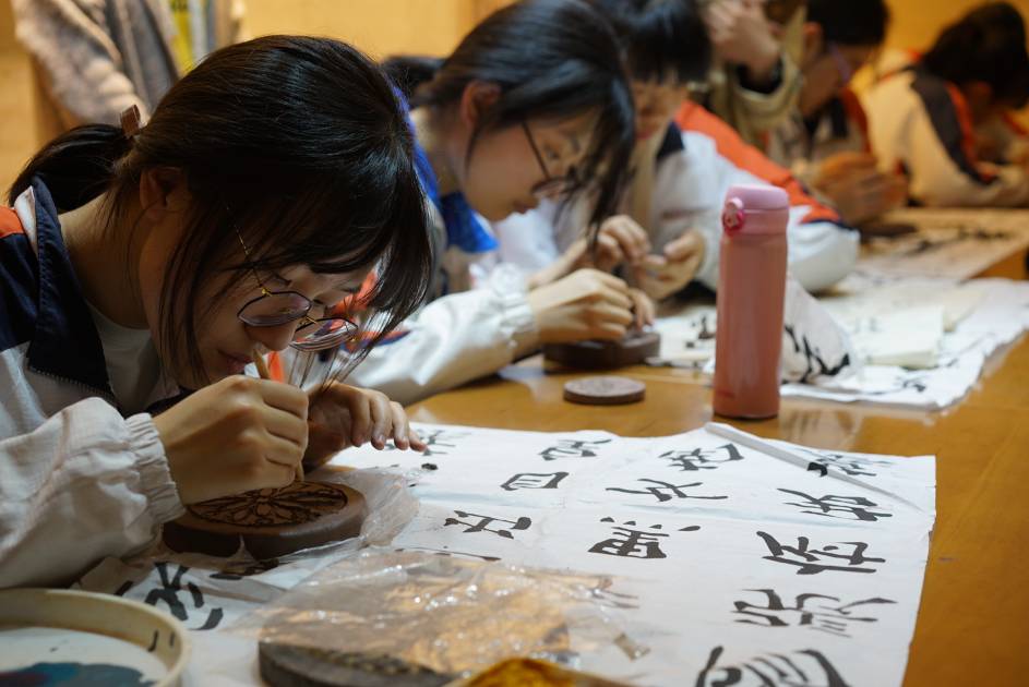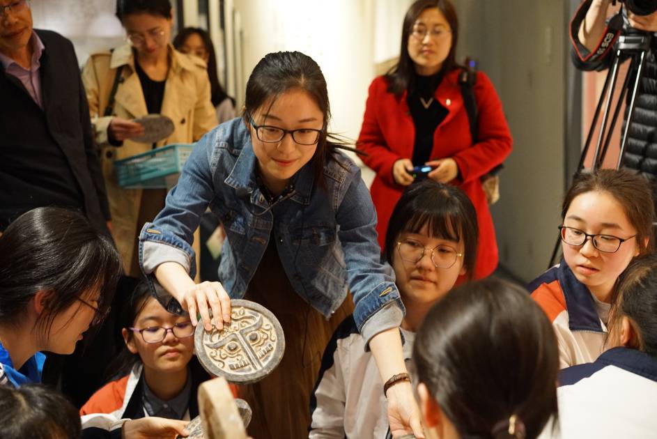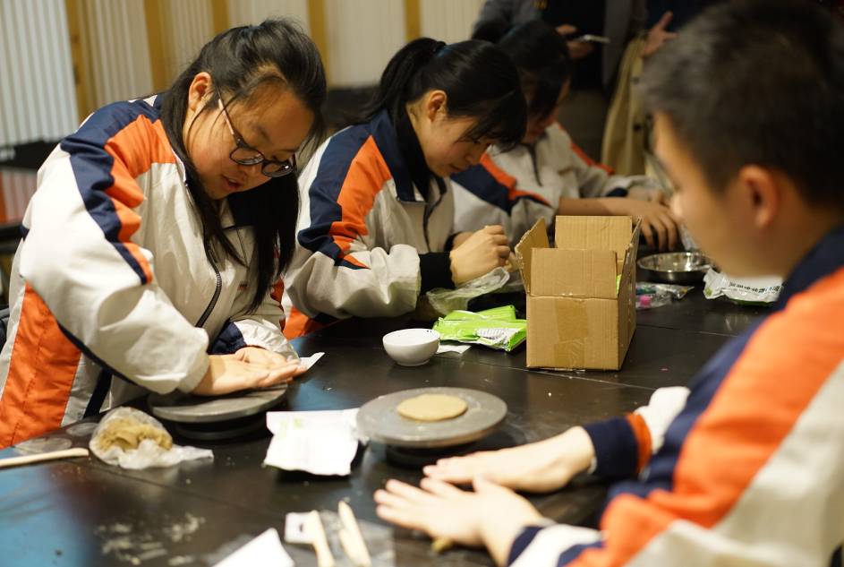 一切都太有新鲜感了,上课的地点不再是教室,可以零距离接触文物,每个人都兴奋地找出自己最喜欢的瓦当图,同学间俏皮地模仿起瓦当上的各式表情包。之后同学们围坐在一起,开始了瓦当地制作工艺,泥胚塑形、刻刀制图、上色拓印……好不热闹!