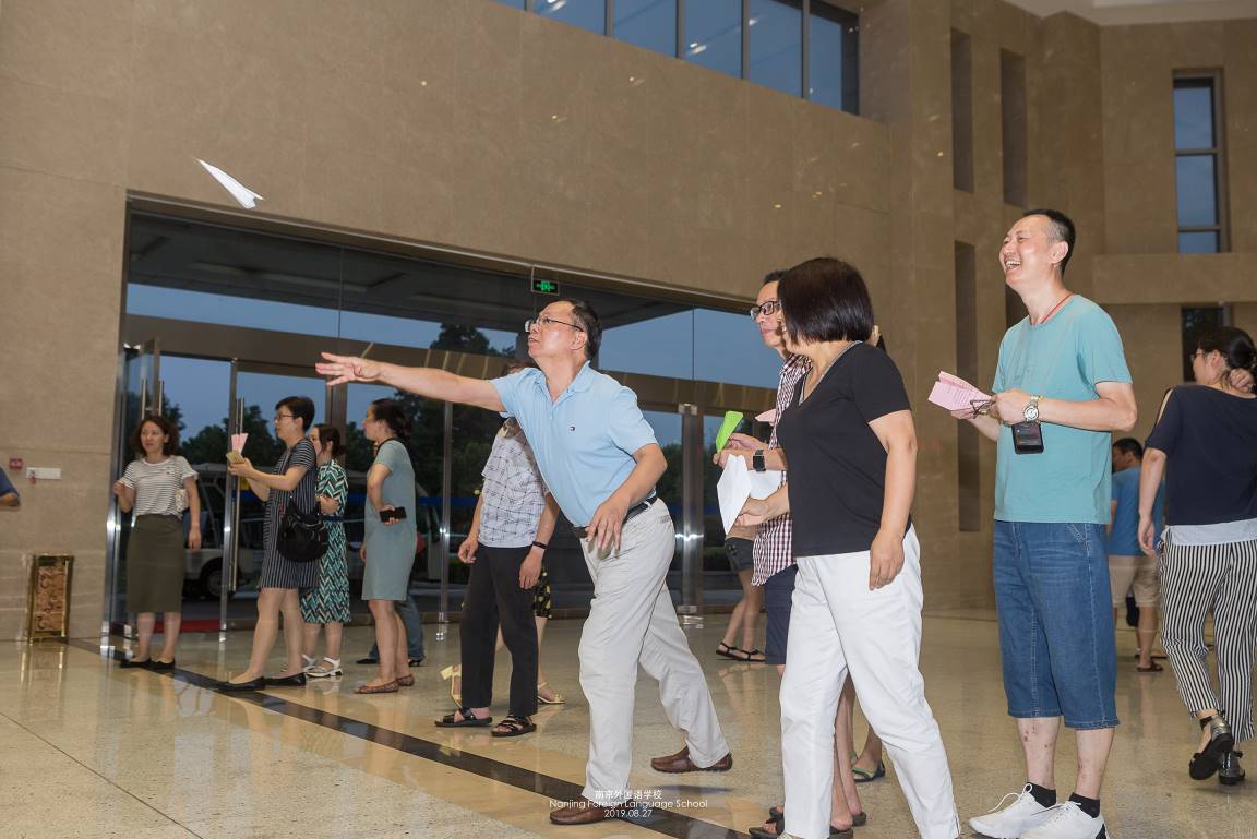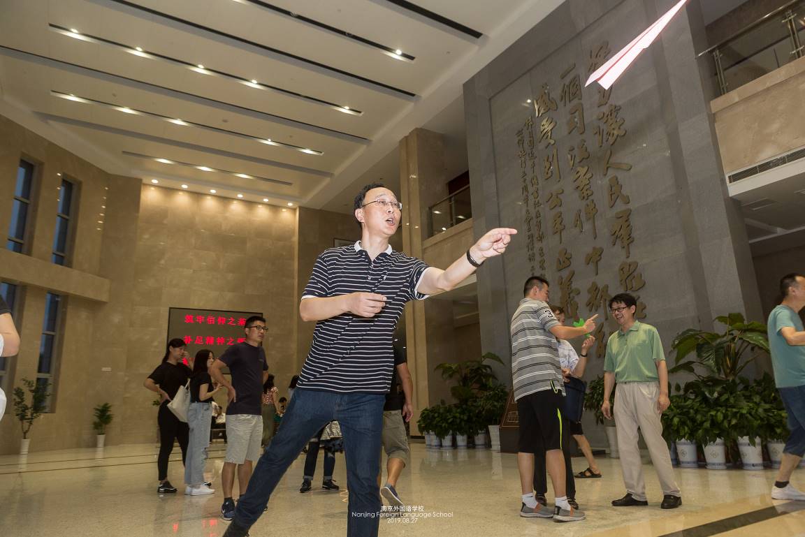 激情穿越70年,这是考验各位老师手眼协调能力的项目。每个工会组选出10人,现场自制纸飞机、投掷纸飞机,要求飞机穿过70周年花环,规定时间内穿过花环的飞机数量多的小组获胜。赛前,参赛队伍认真研究如何让纸飞机飞得更远更直;比赛过程中,各参赛队伍更是铆足力气,力求百发百中。
