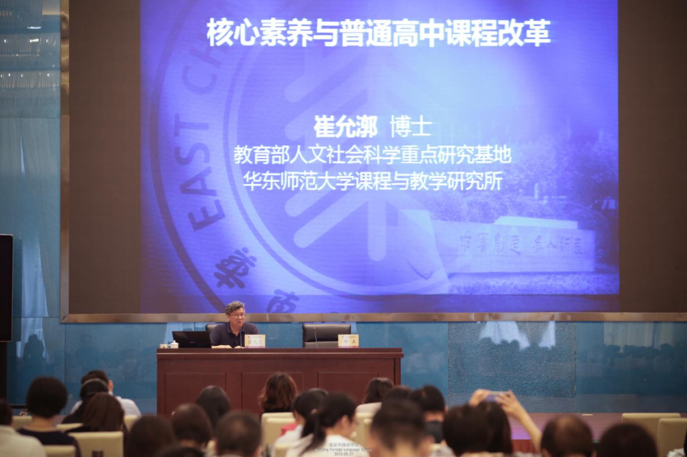 八月二十七号上午,在邹正校长的主持下,教育部人文社会科学重点研究基地、华东师范大学课程与教学研究所崔允漷教授为大家带来《核心素养与普通高中课程改革》的生动报告。崔教授跟大家分享了三方面内容:核心素养及其意义、普通高中课程方案与课程标准、指向学科核心素养的教学变革。他认为,核心素养是个体在面对复杂的不确定情境时,综合运用所学的知识、观念、方法解决实际问题所表现出来的关键能力、必备品格与价值观念。核心素养是国际课程改革的最强音。最后,崔教授还提出了几点有待进一步探讨的问题如“学校教育与生活中的真实情境”“学科核心素养与跨学科核心素养”等供大家思考。