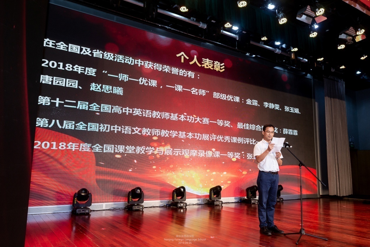 南外是一个和谐的大家庭。在过去的一学年中,全体教职工团结一心,取得了辉煌的成绩。许多教职工受到上级的表彰,刘前树书记宣读了2018-2019学年表彰名单。