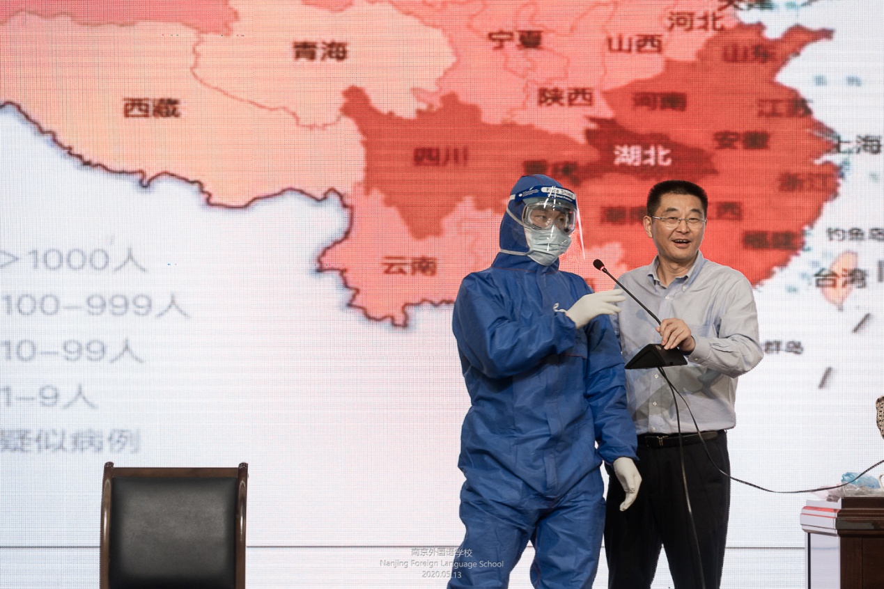现场,鲁翔特意为大家带来一整套防护物资,邀请感兴趣的老师上台感受。手套三层、口罩两层、防护服两层、鞋子两层……10分钟,体验的老师已经汗流满面、 脸上还印着勒痕。而一线医护人员一穿就要4个小时,困难及不适程度可见一斑,现场老师们不禁以掌声致敬。